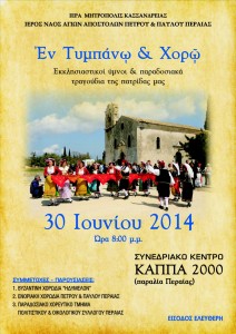 Τό ἐκκλησιαστικό Συμβούλιο τοῦ Ἱ.Ν. τῶν Ἁγίων Ἀποστόλων Πέτρου & Παύλου Περαίας, μέ ἀφορμή τήν ἑορτή & πανήγυρη τῶν πρωτοκορυφαίων ἀποστόλων Πέτρου & Παύλου, σᾶς καλεῖ νά συμμετέχετε στή μουσικοχορευτική ἐκδήλωση, ἡ ὁποία θά πραγματοποιηθεῖ στό συνεδριακό κέντρο ΚΑΠΠΑ 2000 (παραλία Περαίας) τή Δευτέρα 30-06-2014 & ὥρα 8:00 μ.μ..
